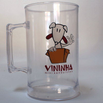 Canecas de Chopp Capacidade 500 ml; Altura da caneca : 12,5 cm; Composição do Produto: PS (poliestireno) atóxico.Área de Impressão: Área de gravação máxima frente /verso:7 cm largura x 6,5 cm altura; Impressão total: 14,5 x 6,5 cm. Tipos de Impressão: Silk / Transfer; Dados da Embalagem: Medidas da caixa: 65 cm x 42 cm x 42 cm: Capacidade: 120 canecas por caixa; Peso por caixa: 10 Kg